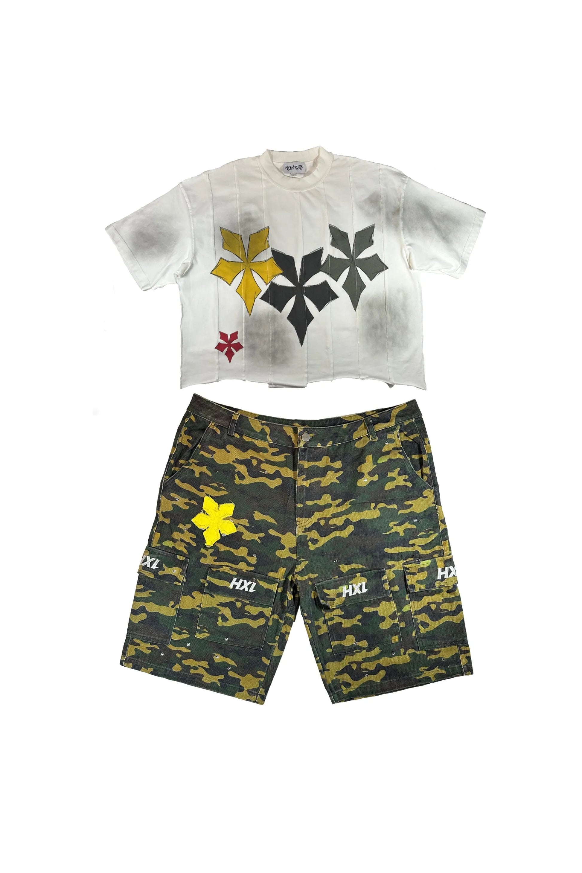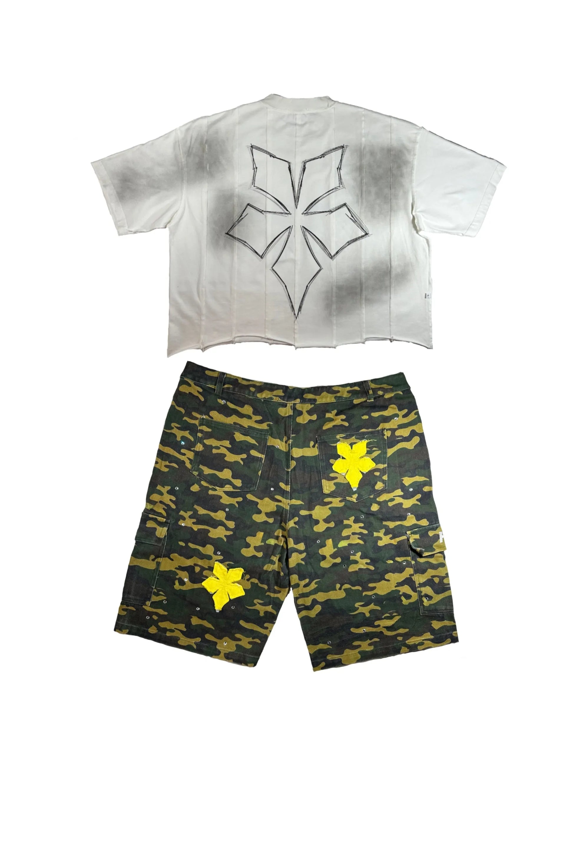 The pants? Cargo style with that extra swag you need, 280 GSM COTTON DENIM, CAMO STYLE, 8 POCKETS, RHINESTONES, DISTRESSED APPLIQUÉ and EMBROIDERY.